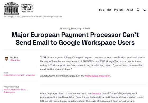 ヨーロッパで決済・銀行サービスなどを提供するViva.comで、アカウント作成時のメール認証が企業向けメールサービスであるGoogle Workspaceのメールアドレス宛だと届かない事例が報告されました。