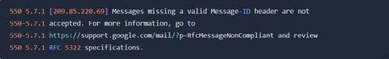 バウンスの理由として表示されたのは「有効なMessage-IDヘッダーがないメールは受け付けない」という内容で、Google Workspace側がRFC 5322への準拠を求めて拒否していることが示されていました。RFC 5322はFromやSubjectなどのメールヘッダーをどう書くかを含め、メールの基本的な形を決めている仕様です。