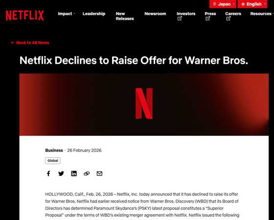 Netflixは買収撤退の意図を、「Netflixが交渉してきた取引は、規制当局の承認への明確な道筋を備え、株主価値を創出するものでした。しかし、当社は常に規律を重んじており、パラマウント・スカイダンスの最新の提案に匹敵する価格では、もはや財務的に魅力的ではないと判断し、パラマウント・スカイダンスの提案に同調することを辞退いたします」と説明しています。