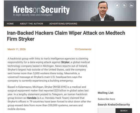 Strykerのウェブサイトによると、同社は世界の61カ国に5万6000人の従業員を抱えています。2026年3月11日にセキュリティアナリストのブライアン・クレブス氏がStryker本社に電話したところ、「現在、建物内で緊急事態が発生しています。後ほどもう一度お電話ください」という留守番電話メッセージが再生されたそうです。