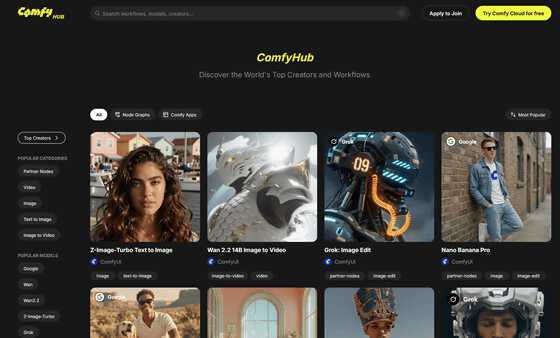 なお、App Modeと同時にワークフローの共有サイトであるComfyHubも公開されました。ComfyHubはプレビュー版として公開されており、開発チームによって厳選されたワークフローが分かりやすくまとめられています。