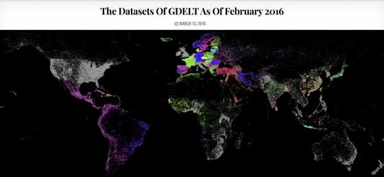 「GDELTプロジェクト」は世界各国の100以上の言語で発信される放送・新聞・ウェブニュースを常に収集し、アーカイブとして記録しています。地球上のあらゆる人々、組織、場所、テーマ、ニュースソース、イベントを単一の巨大なネットワークに結び付けることで、世界中で何が起こっているのか、その背景に何があるのか、誰が関わっているのか、そして人々がそれについてどのように感じているのかを毎日記録してデータベースとして提供しているほか、分析した実験結果などを公開しています。