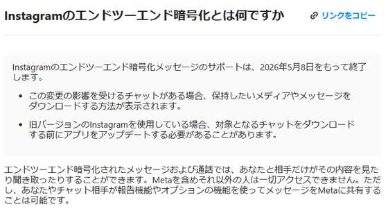Metaが、Instagramのエンドツーエンド暗号化(E2EE)メッセージのサポートを2026年5月8日をもって終了することを明らかにしました。
