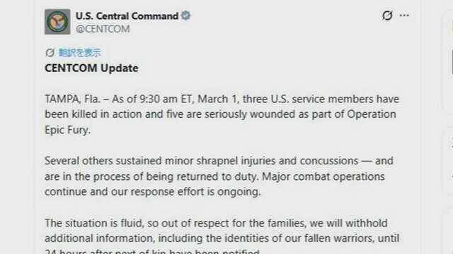アメリカ中央軍は1日、これまでのイランへの軍事攻撃「壮大な怒り」作戦のなかで、アメリカ軍関係者3人が死亡、5人が重傷を負ったと発表しました。また、他にも何人かのアメリカ軍の関係者が、けがや脳震とうの治療を受けているということです。