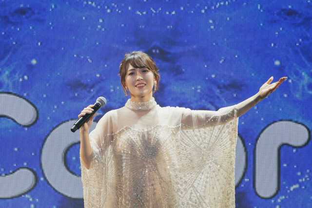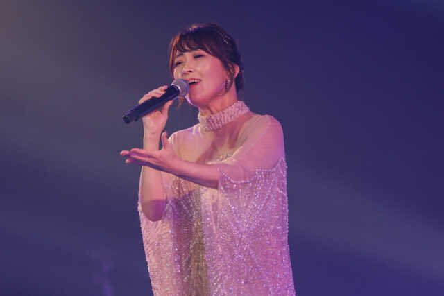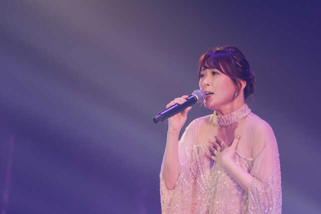2曲目はオリジナル曲「still here」。MCでは「昨年、乳がんという人生で大きな試練を経験しました。同じように何かにつまずいて立ち止まってしまっている方の背中をそっと押せたらと思って作った曲です」と語り、会場全体が聞き入る空気に変わった。歌詞の一言一言を届けるように歌うバラードで、ソプラノではない表現も説得力がある。それでいて、要所で繰り出されるソプラノの歌声は圧巻。観客の心を掴み、深い余韻を残した。